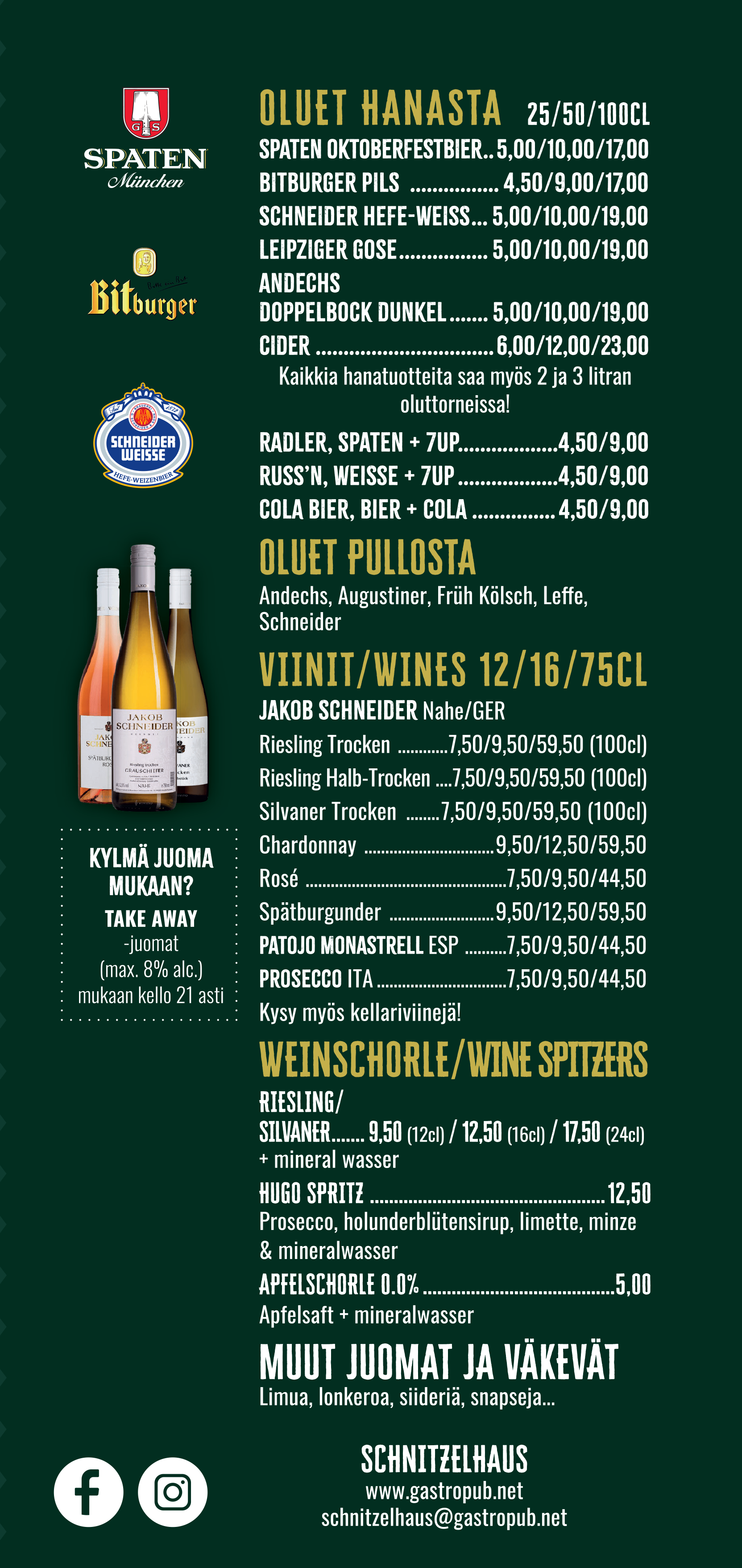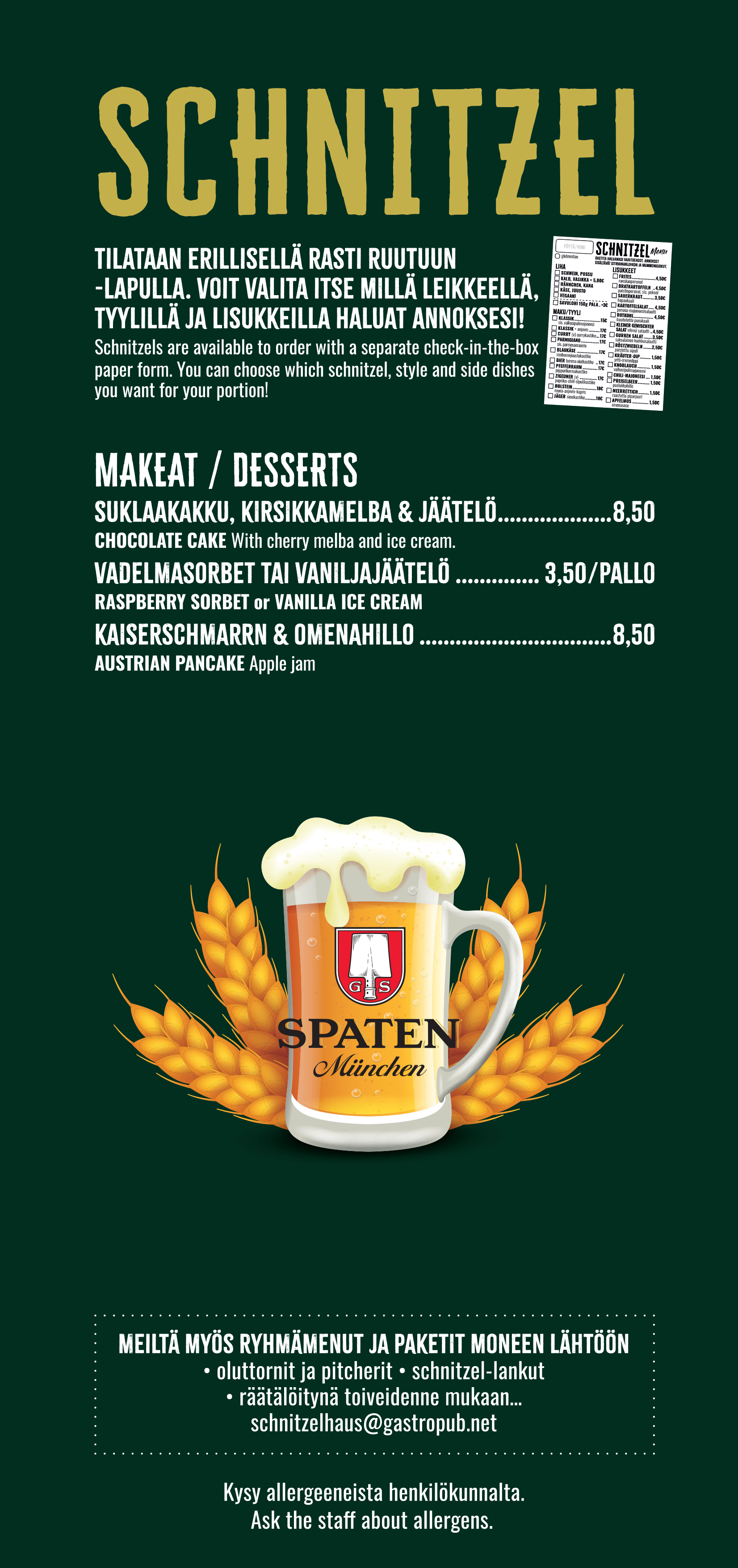 HUOM! Ryhmävaraustiedustelut: schnitzelhaus@gastropub.net